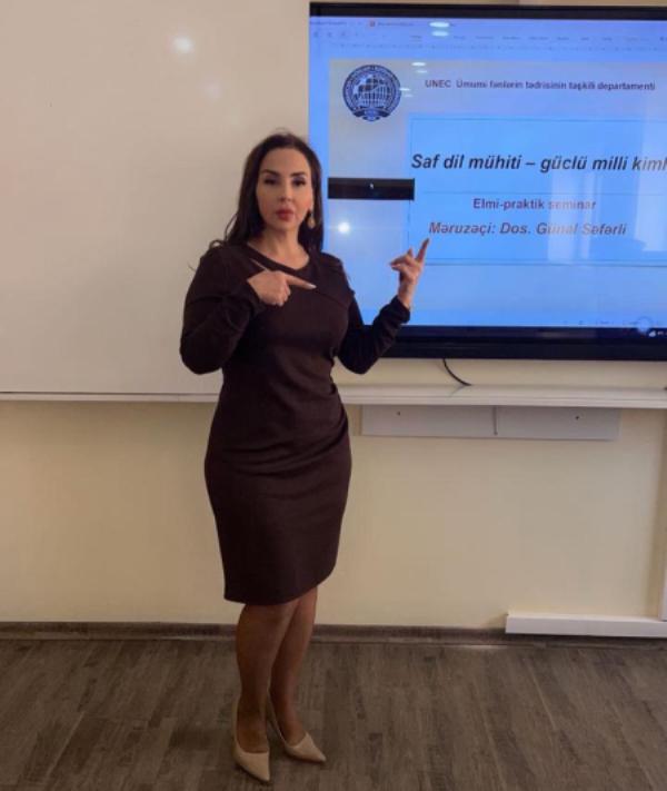 Seminarda “Azərbaycan dili” kafedrasının dosenti Günal Səfərli çıxış edərək tarix boyu xalqımıza, mədəniyyətimizə, elmimizə və dilimizə müxtəlif istiqamətlərdən təsirlərin olmasına baxmayaraq, Azərbaycan dilinin milli kimliyimizin əsas dayağı kimi qorunub saxlanıldığını bildirib. Vurğulayıb ki, ana dilinin ölkədə hakim mövqeyə yüksəlməsi yalnız onun dövlət dili elan olunması ilə deyil, həm də cəmiyyət həyatının bütün sahələrində tətbiqi və inkişafı ilə mümkün olub.