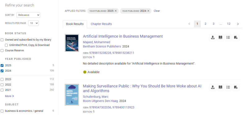 UNEC-in abunə olduğu ProQuestEbookCentral (https://ebookcentral.proquest.com/lib/azerbastat/home.action) bazası üzrə Süni İntellekt (Sİ) mövzusunda araşdırma apardıq. Qeyd edim ki, bazada əsasən dünyanın bir çox nəşriyyatlarında çap edilmiş müxtəlif sahələr üzrə e-kitablar təqdim edilir. Bazada Sİ üzrə 22539 kitab var. Son on illik dövr üzrə apardığımız təhlilin nəticəsinə əsasən bazada 7015 e-kitab aşkar edilib ki, bu kitabların da 1500-ə qədəri iqtisadiyyatın müxtəlif sahələrini əhatə edir. Mövzu üzrə kitabların əksəriyyəti- 6938-i ingilis dilində, 22-si fransız, 21-i alman, 20-si ispan dilində, qalan qismi isə tək-tək olmaqla müxtəlif dillərdədir.