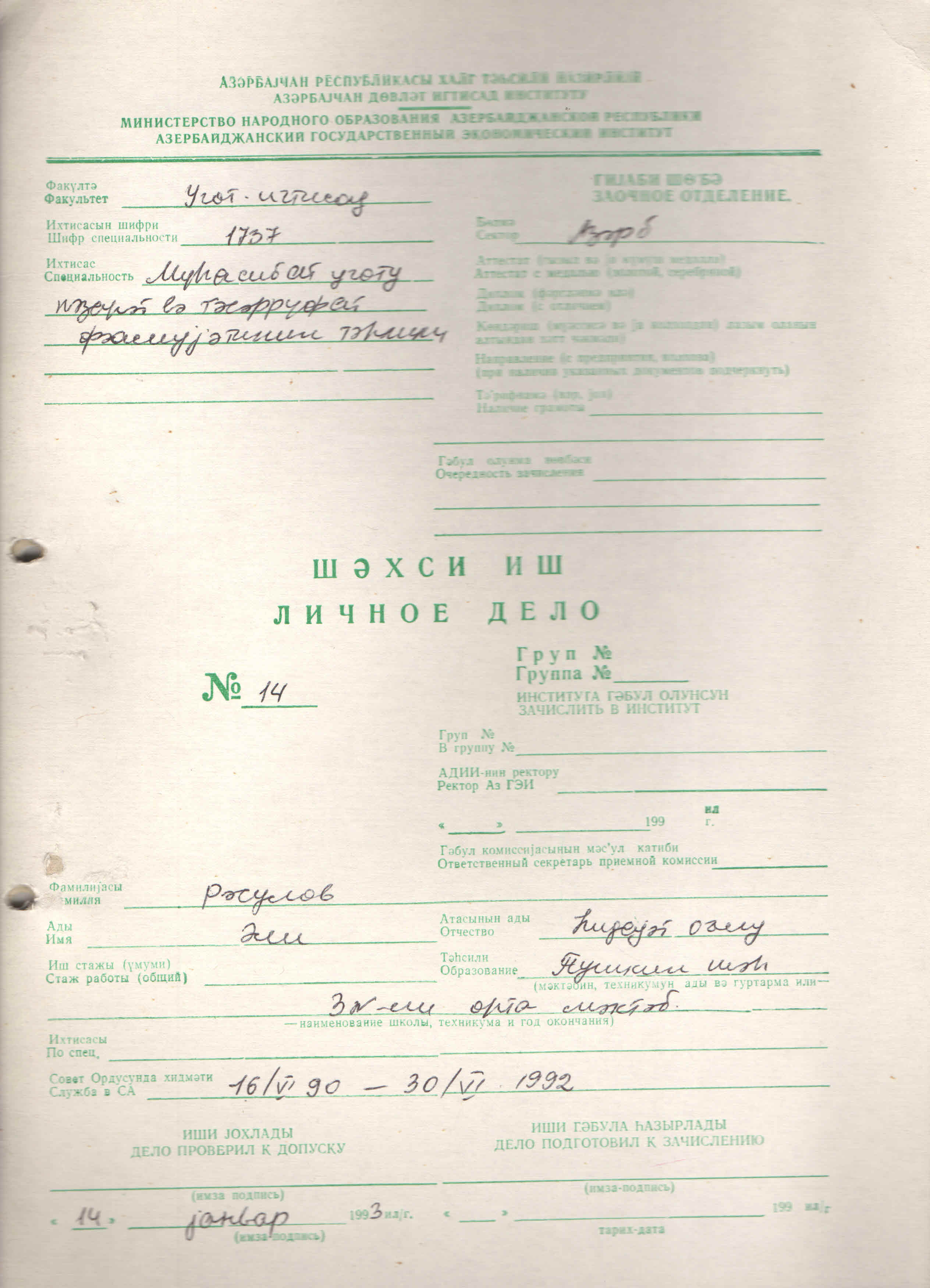 Обучаясь на заочном отделении указанной специальности уже на I курсе оставив обучение добровольно отправился в Карабах.